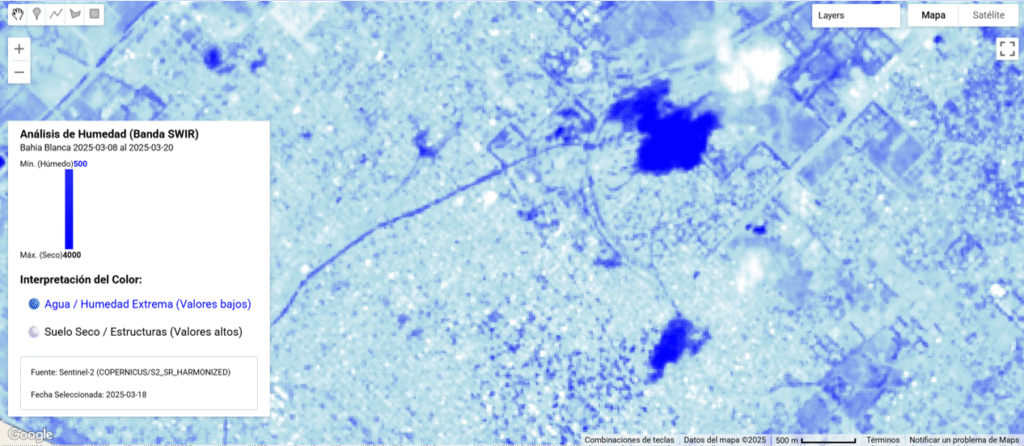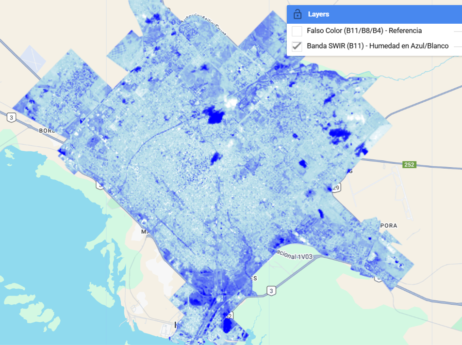 La idea de este mapa es observar, mediante las herramientas disponibles, cómo impacta en un territorio (y sus componentes), una inusual cantidad de caída de agua. Para tal fin, analicé de imágenes satelitales de la ciudad de Bahía Blanca, utilizando la Banda SWIR (Short-Wave Infrared). Los valores de reflectancia de este indicador, se usan para estimar el contenido de humedad existente en el suelo.