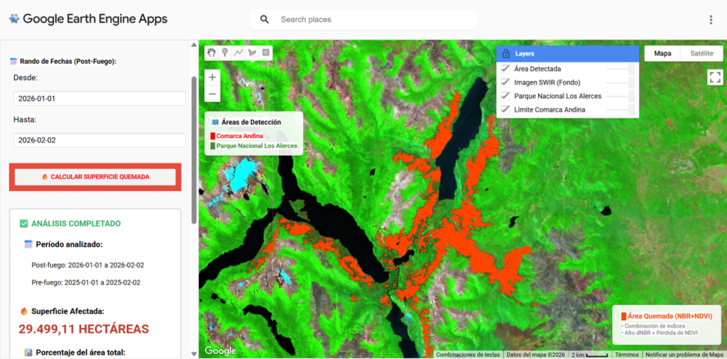 Debajo está el botón con acceso a la App de monitoreo de incendios de la Comarca Andina. Si seteamos la fecha del ultimo mes (todo enero), tenemos 30.000 hectáreas quemadas. Si analizamos la ventana desde diciembre, son 37.000 hasta febrero. Reitero, porque es importante; esa superficie no es la del incendio activo, es la zona ya quemada. Es decir, hoy tenemos el doble de superficie comprometidas si sumamos lo quemado + lo activo.