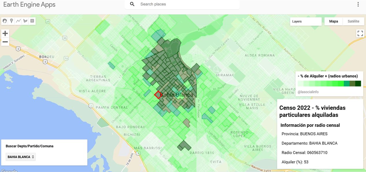 ¿Qué es el «Mapa de la Impropiedad»? La proporción de viviendas particulares alquiladas en los radios censales urbanos a nivel nacional. Nuevamente, es interesante analizarlo a nivel ciudad o localidad. La app tiene un buscador (algo rudimentario… es lo que hay) por departamento, partido o comuna, para facilitar la navegación.