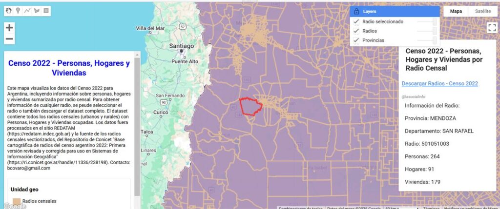 Básicamente, una breve descripción del mapa con las fuentes de datos y de cartografía (con sus enlaces), un buscador y algunas cositas mas. Mi intención es seguir habiendo estas aplicaciones con toda la información del Censo 22, siempre y cuando mi tiempo lo permita.